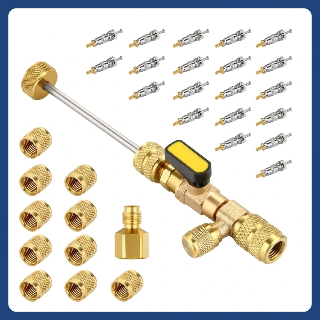 Package Included: 1* Valve Core Remover, 1 *R410 R32 Brass Adapter, 20* Valve Cores, 10* brass nuts.